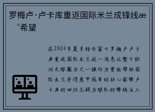在2024年夏季转会窗口,罗梅卢·卢卡库重返国际米兰,这一消息让整个欧洲足球圈为之一振。作为曾经帮助国际米兰夺得意甲冠军的核心前锋,卢卡库的回归无疑为球队的锋线注入了新的活力与希望。与此同时,国际米兰...