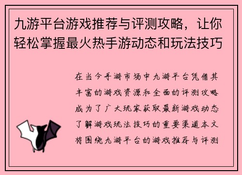 在当今手游市场中,九游平台凭借其丰富的游戏资源和全面的评测攻略,成为了广大玩家获取最新游戏动态、了解游戏玩法技巧的重要渠道。本文将围绕九游平台的游戏推荐与评测攻略展开,帮助玩家更好地掌握最火热的手游动...